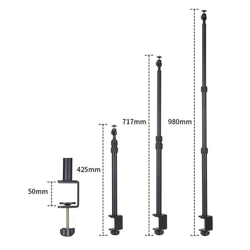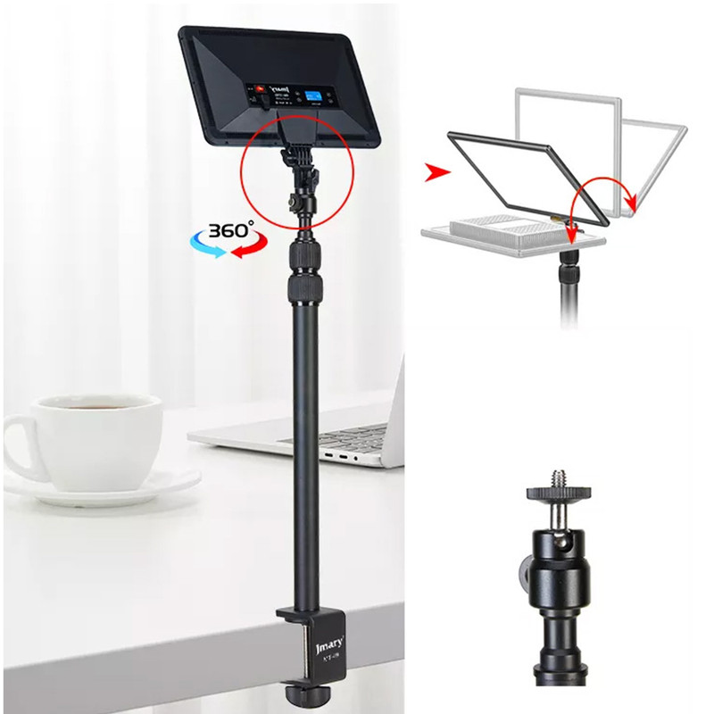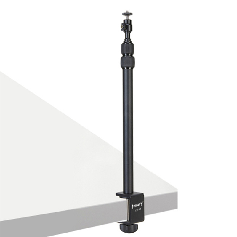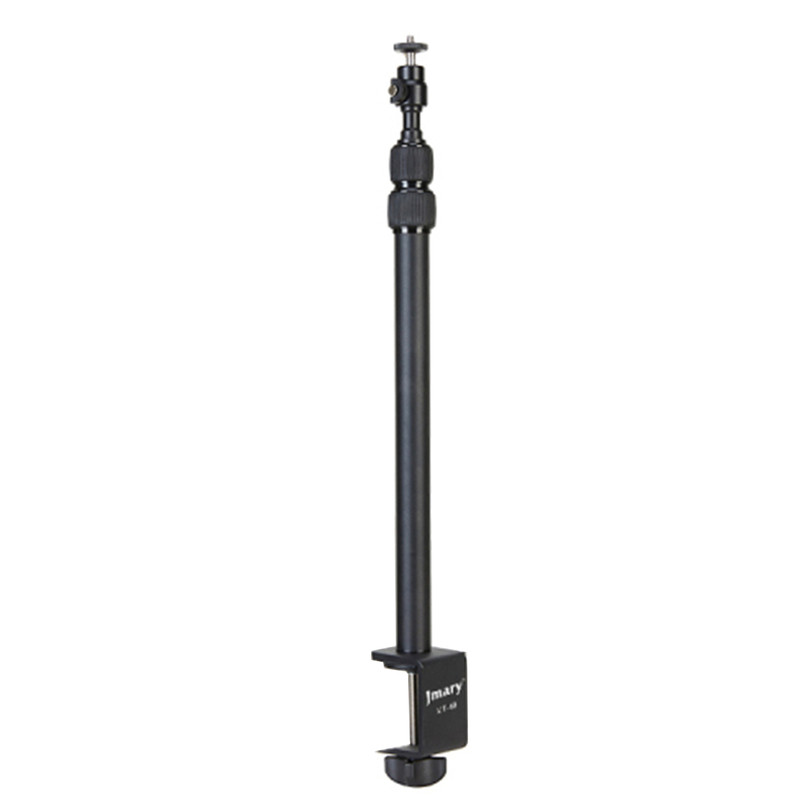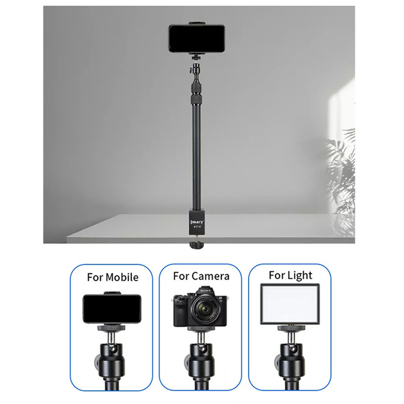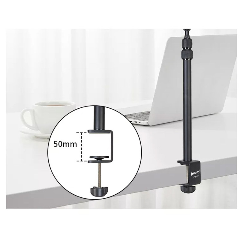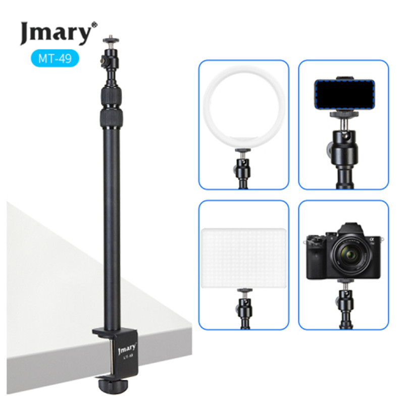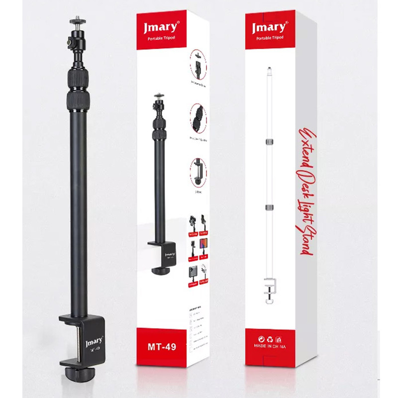 پایه نور جیماری مدل Jmary MT-49 دارای مغزی استاندارد نورهای حرفهای با پیچ استاندارد نصب انواع نور LED و یا حتی دوربین است که به همراه آن یک عدد بالهد برای دستیابی به زوایای مختلف و البته یک عدد هولدر موبایل دارای کفشک Cold Shoe نیز عرضه شده است. این پایه نور ساختاری شبیه به یک مونوپاد تلسکوپی سه تکه دارد که کمترین ارتفاع آن 42.5 و حداکثر ارتفاع آن برابر با 98 سانتیمتر است. قطعات تلسکوپی Jmary MT-49 به وسیلهی قفل پیچی باز و بسته میشوند و بخش زیرین آن از طریق یک گیرهی پیچی قابل نصب روی انواع لبهی میز با ضخامت حداکثر 5 سانتیمتر است. گیرهی نگهدارندهی این محصول دارای لایهی محافظ برای جلوگیری از زخمی شدن سطح میز نیز هست. جیماری MT-49 بدنهای از جنس آلومینیوم دارد و وزن آن تنها 570 گرم است و تحمل وزن این محصول نیز برابر با یک کیلوگرم میباشد.