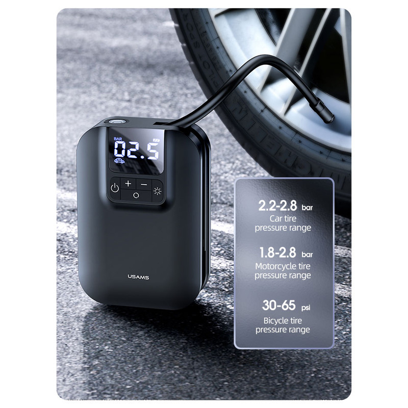 پمپ باد لاستیک یوسمز، دستگاهی مستطیلی شکل مشابه به ظاهر یک پاوربانک است که به صورت هوشمندانه فشار هوا لاستیک را تنظیم می کند.
