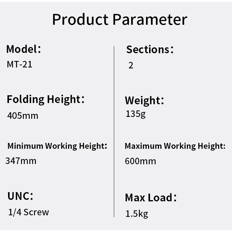 یکی از ویژگیهای برجسته این بازو، قابلیت تنظیم ارتفاع آن است. با ارتفاع حداقل 347 میلیمتر و حداکثر 600 میلیمتر، شما میتوانید به راحتی در موقعیتهای مختلف عکاسی کرده و بهترین زاویه را برای پروژههای خود انتخاب کنید. ارتفاع جمع شده آن نیز 405 میلیمتر است که باعث میشود این محصول به راحتی در کیف عکاسی شما جا بگیرد.